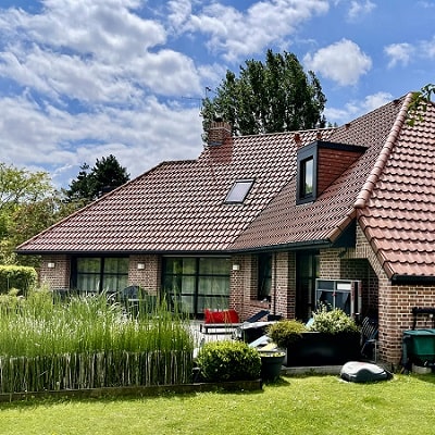 Exemple d’une maison avec deux types de toitures différentes (plat et incliné). Nous y intervenons pour l’entretien régulier dans les Hauts-de-France. Nous avons transformé le carport en garage fermé bien isolé et ajouté l’électricité. À l’extérieur, nous avons posé les grillages de clôture, la pose du portail électrique et de la porte du garage ainsi que la porte d’entrée.